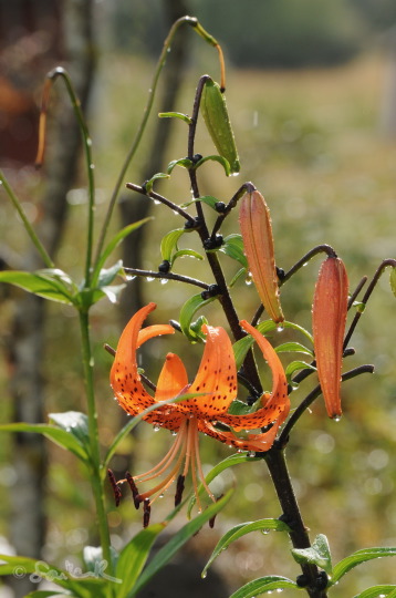 Meillä oli todella kuiva kesä. Kaivoissa oli vesi hälyttävän alhaalla. Kun sade viimein elokuun puolivälissä tuli, ryntäsin pihalle kuvaamaan ihanaa kaivattua virkistävää sadetta. Peurat olivat onneksi jättäneet muutaman nupun tiikerililjaan, niin sain tämän mehukkaan kuvan.