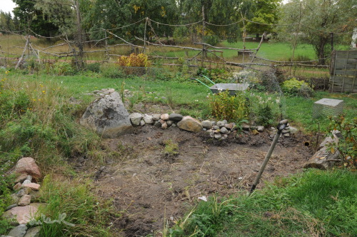Lisää realismikuvaa: tänne kirjosorsimot päätyivät. Niitä ei tarvitse säkittää, sillä kuivassa paikassa ne eivät kauaa elossa pysy, kokeiltu on. Kuvassa näkyy kasvimaa, joka odottaa uutta kohopenkkiä sängynraadon ympärille, ja kiveystä matonraatojen päälle. Vasemmalla on preeriaprojekti, alareunaan tulee istutuksia vielä vähän korkeammaksi tulevan kivipengermän päälle. Olin ajatellut siihen pensasaitaa marjakuusista, mutta yllätys yllätys – peurat söivät taimet.