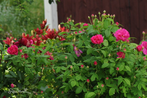 Apteekkarinruusu punaisessa villissä penkissä yhdessä tarhasarjaliljojen kanssa.