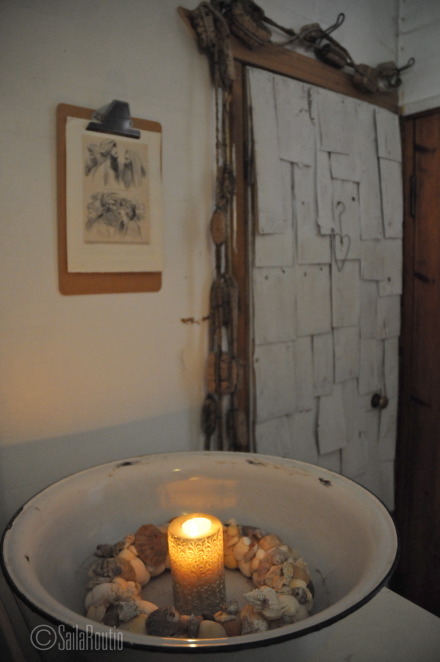 Sain ystävältä eilen hienon lahjan: itse tehdyn kranssin matkoilta kerätyistä simpukankuorista. Se sopii kuin valettu eteisen isoon vatiin, jossa pidän kynttilää. Sytytin sen Helmin muistolle, simpukoissakin on helmiäistä.