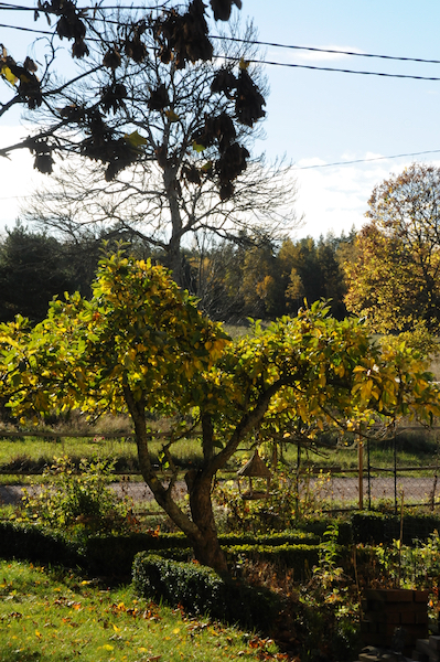 Omenapuut ovat alkaneet vaihtaa väriä, tällä hetkellä se on hauska kelta-vihreä. 'Åkerö' onkin nyt puutarhani ainoa omenapuu, kun vesimyyrät söivät toisen juuret kokonaan viime talvena.